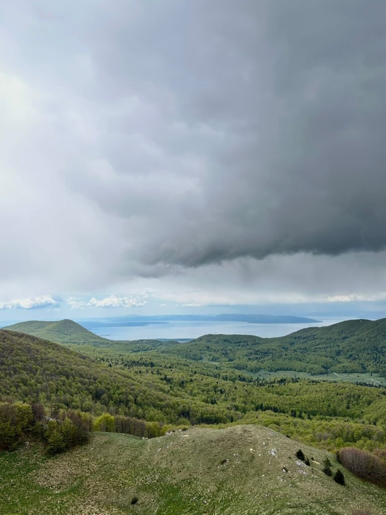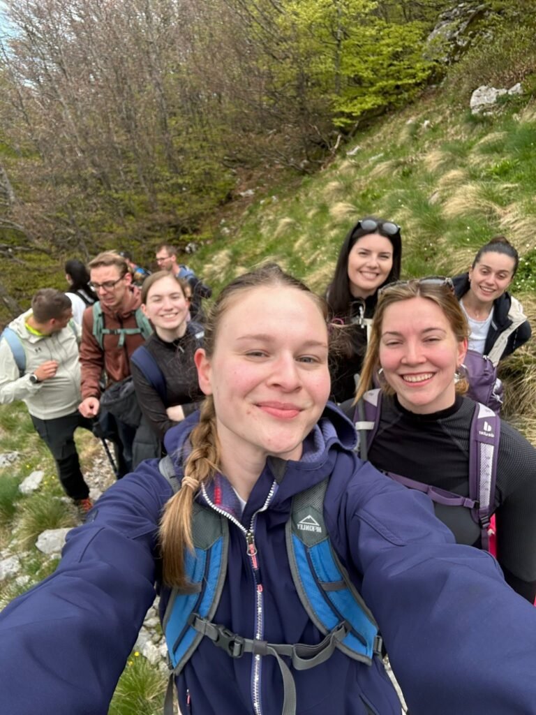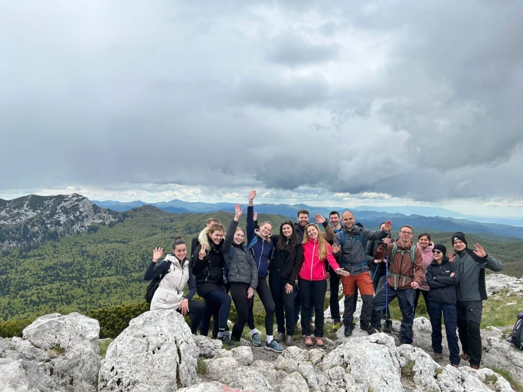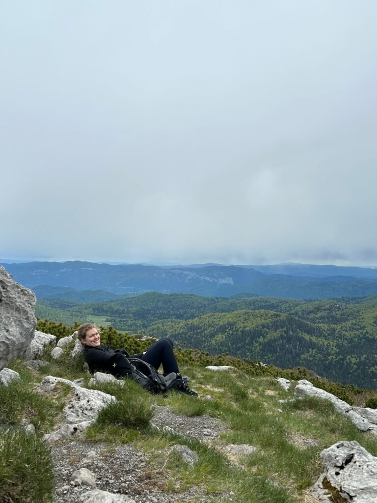 Uspon smo odradili za otprilike sat vremena. Već pred vrh kad smo izašli iz šume i penjali se travnjakom bio je vidljiv prekrasan pogled na more. Na samom vrhu je postalo nešto zahtjevnije, jer smo se morali popeti preko stijena, ali osjećaj i pogled na vrhu su vrijedili truda. S vrha Snježnik na 1506 metara nadmorske visine puca pogled na svih 360 stupnjeva, a onaj najljepši je prema moru, točnije otocima Krku i Cresu. Neplanirano, na vrhu smo napravili nešto veću pauzu jer smo već tada ogladnjeli.